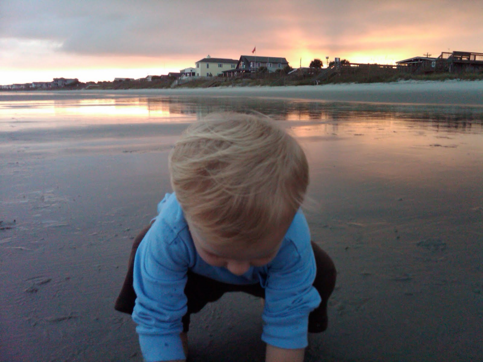 I'm just putting this picture on here because I think it is so beautiful. This afternoon, Harrison, the pups, and I were out on the beach. Since we moved here, Harrison has seen it necessary and hilarious to shove sand in his mouth. I'm not sure that he is eating it as I don't see it (go in or come out, for that matter). I remember the first time he started eating sand, I desperately wished there was a "non-toxic" label like on the crayons. Soon I realized that the sand wasn't going to hurt him. In fact, I think my father told me, "oh, it's good for him." Sure it is. Tonight, as he was grabbing the sand and squeezing it in his fists, then letting it drip out, it made me think of how fast time is going. I feel like the past 20 months (Harrison is 20 months today), has just slipped through my fingers. I've tried to grab on to as much as I can, but it really is unreal how fast it all goes. Everyone tells you to soak up the moments, and I think we do as much as we can, but I just had no idea time would escape me the way it has with Harrison. So, I sort of feel like the past 20 months have been like fistfuls of sand, I have so many memories that I will find in places that I didn't know that I have. I'm sorry the pictures aren't clearer; I took them with my phone.